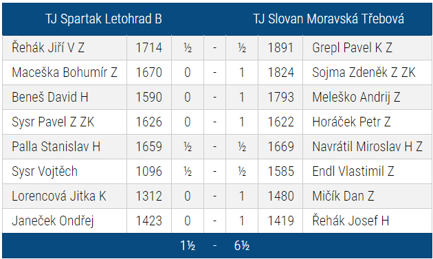 V osmém kole jsme odjeli do Letohradu, kde jsme odehráli výborný zápas a jasně zvítězili 6,5:1,5. Je ovšem nutno podotknout, že se jednalo o letohradské béčko a jejich tým dokonce nepostavil přítomnou svoji jedničku Kamila Mikysku.
