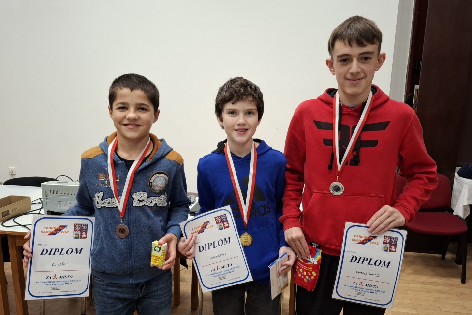 Na druhém kvalifikačním turnaji Krajského přeboru mládeže, který se konal v Pardubicích, bojovalo o postup do závěrečného finálového turnaje sedm našich mládežníků. Nejmladší kategorii HD10 se nám zatím nepodařilo neobsadit. V kategorii HD12 jsme měli dva zástupce. Honzíka Nguena a Toníka Bednáře. A především Toník velmi mile překvapil. Uhrál si 4,5 bodu ze sedmi a hned prvním svým mistrovským turnajem si zajistil účast ve finále. V kategorii HD14 nastoupil Ondra Šesták a náš druhý nováček Denis Rychlý. Ondrovi se turnaj moc nepovedl, skončil v polovině tabulky a na postupová místa to měl tentokrát hodně daleko. Největší úspěch jsme dosáhli v HD16. Vojtěch Šmehlík potvrdil svým druhým místem, že se s ním musí i letos počítat v závěrečných bojích o post přeborníka kraje. Za to druhému našemu zástupci v této kategorii Danielovi Polákovi se moc nedařilo a také on na postupové příčky nedosáhl. Svůj standart si odehrála Leona Bártová v HD18. Uhrála 50% a se svým výkonem v tak silné konkurenci může být spokojena.