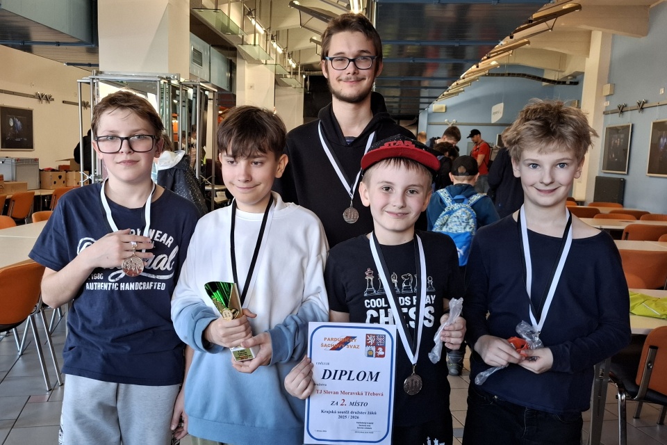 Krajská soutěž družstev žáků se hraje systémem dvou oddělených turnajů, jejíchž výsledky se sečtou a vzejde z nich celkový vítěz. V prvním turnaji, který se hrál v lednu v Lanškrouně, se naší mládežníci umístili na pátém místě. Druhý turnaj se odehrál 7.3. ve Svitavách, kam jsme odjížděli s odhodláním své umístění z prvního klání trochu vylepšit. Naši sestavu ve složení Eliáš Rada, Denis Rychlý, Šimon Kuchynka, Mikuláš Makrlík doplnil Samuel Novotný, který v minulému turnaji pro nemoc nemohl hrát. Kluci hráli výborně, a přestože se pár partií nepovedlo, podařilo se nám ze všech týmů nasbírat nejvíce bodů a celý turnaj vyhrát. Nejvíce se dařilo Samuelovi, který vyhrál všech sedm partií, a právě on měl lví podíl na tomto úspěchu. Po ukončení poslední partie jsme nervózně čekali na sečtení výsledků z obou turnajů, protože jsme tušili, že by to mohlo stačit na stupně vítězů. A také to stačilo, v celkovém hodnocení jsme se umístili na druhém místě a ze Svitav jsme si odvezli pěkný pohár a stříbrné medaile. Skvělý výkon. První příčku obsadila s velkým náskokem Horní Čermná a třetí o jeden bod za námi skončil Kunvald.